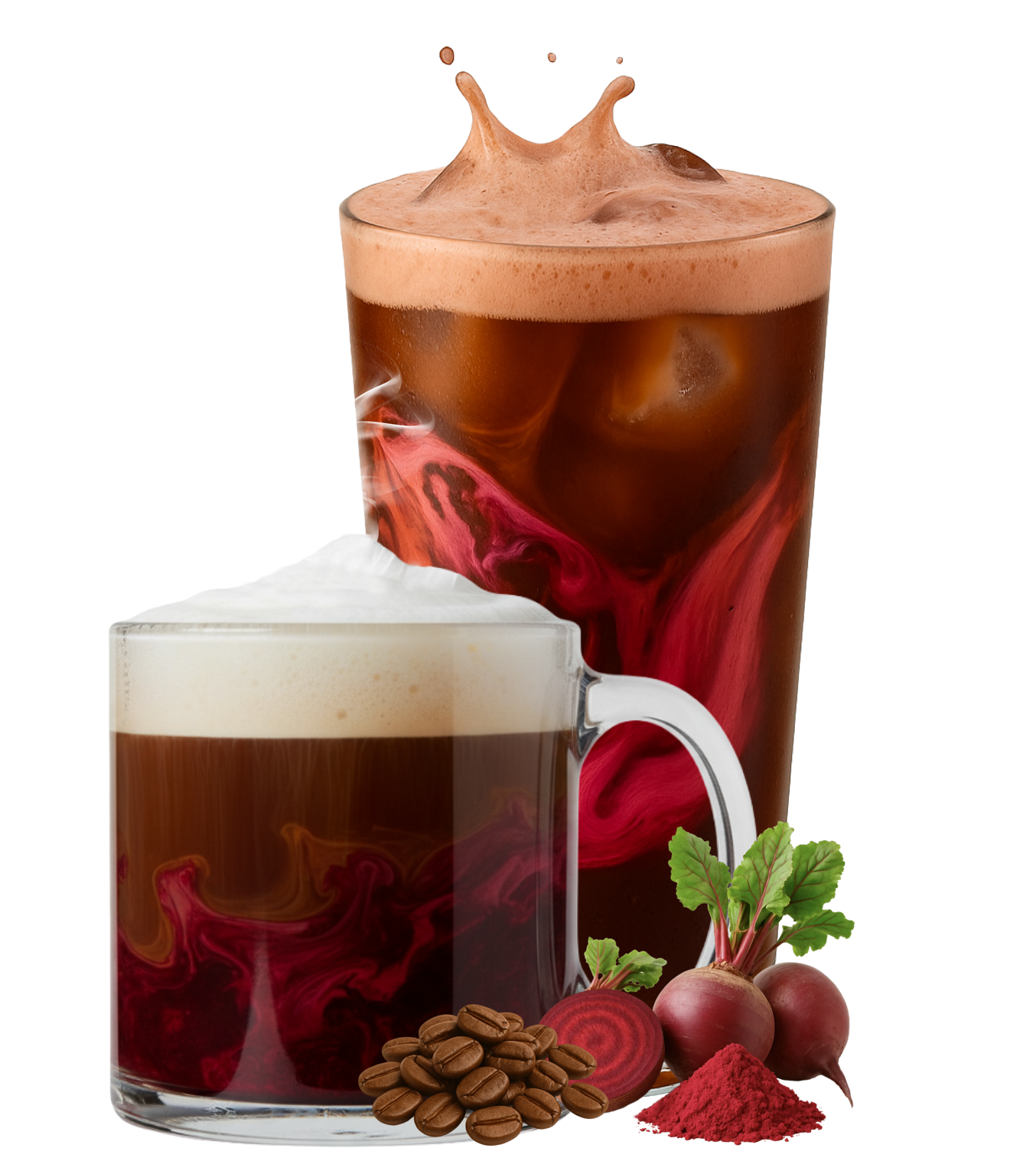 A smooth, earthy-sweet latte made with freshly brewed Arabica coffee, organic beetroot powder, and organic oat milk powder. Naturally colorful and crafted with simple ingredients, it offers a balanced, gently sweet flavor with a warm, comforting finish. A vibrant cup designed for a clean, modern coffee experience.