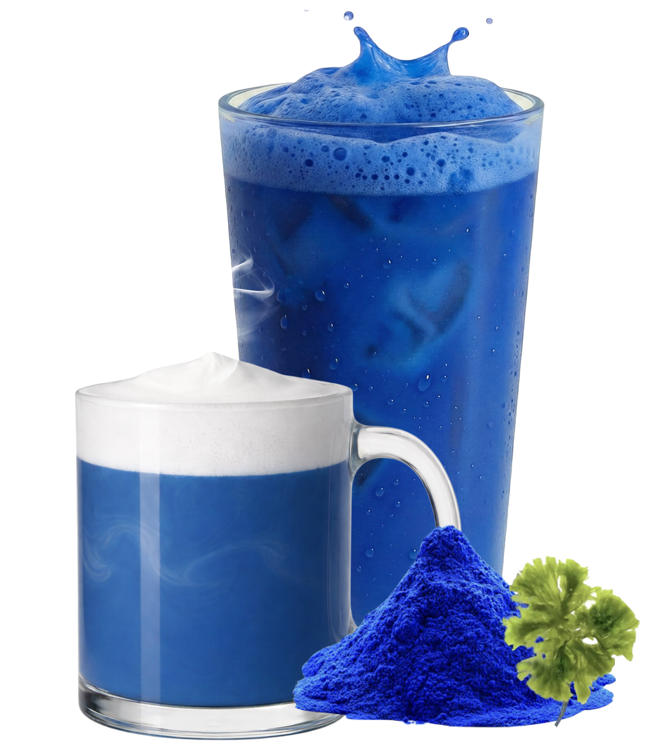 A creamy, ocean-blue latte crafted with organic blue spirulina and organic oat milk powder.