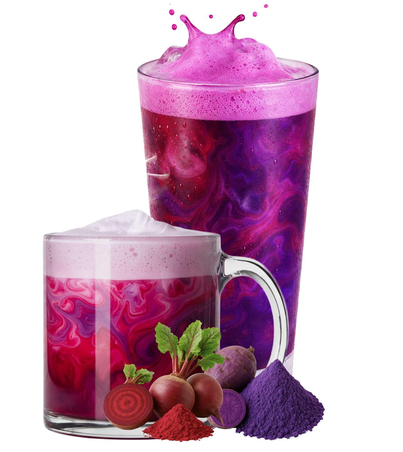A vibrant, earthy-sweet latte made with organic beetroot powder, ube (purple sweet potato) powder, and organic oat milk powder. Naturally colorful and creamy, it offers a gently sweet, dessert-like flavor profile, finished with sugar-free flavoring for a smooth, satisfying sip made with simple ingredients.